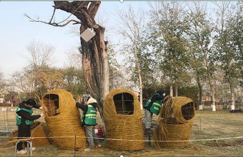 地景藝術以“生態環保、循環利用、變廢為寶”為理念,以園林廢棄物如柳樹枝、海棠枝、竹枝、桃枝等為主材料,通過設計師之手把這些變成了一個個栩栩如生的作品,為冬季景觀增色添彩。